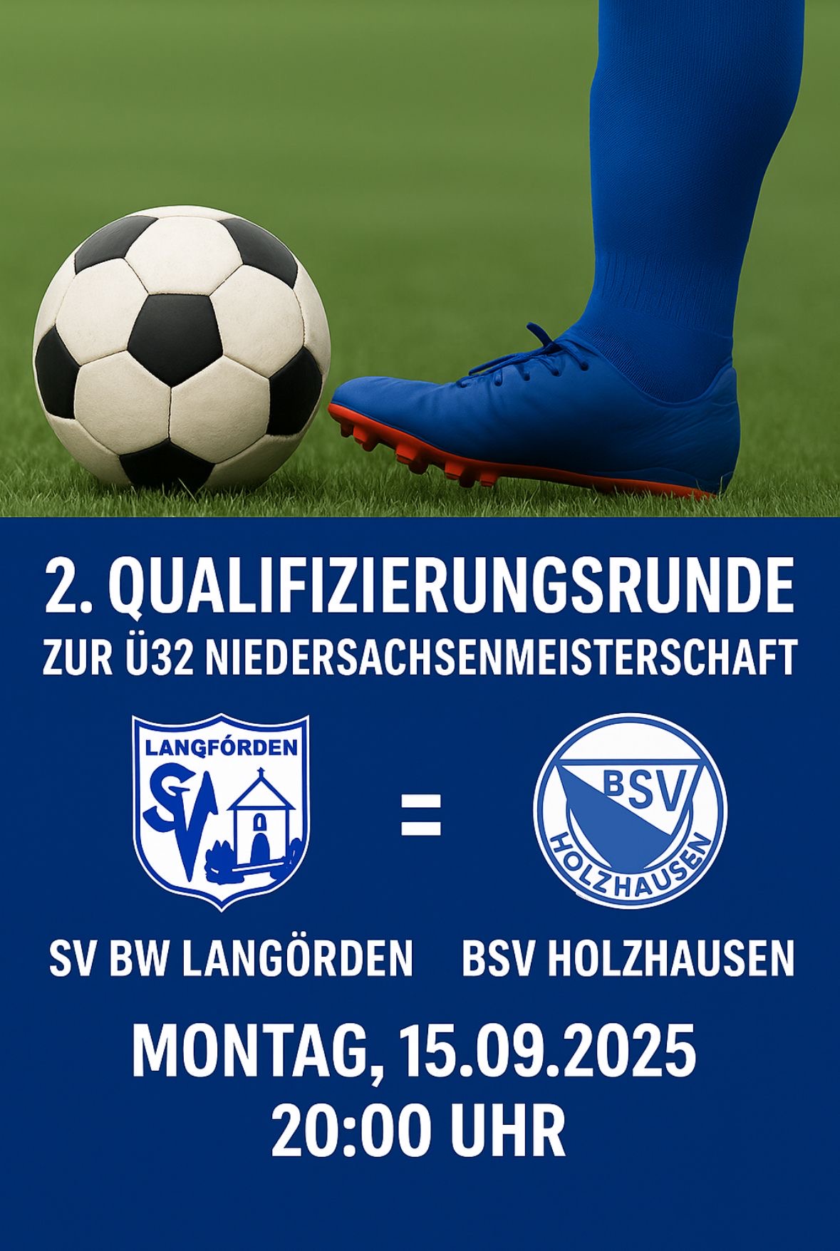 Heute Abend um 20 Uhr startet die 2. Qualifikationsrunde zur Niedersachsenmeisterschaft der Altherren. Unsere Mannschaft trifft auf BSV Holzhausen. Sollten wir gewinnen, sind wir qualifiziert. Gespielt wird auf Platz 1. Für Speisen und Getränke ist wie immer gesorgt. Kommt vorbei und unterstützt unser Team.