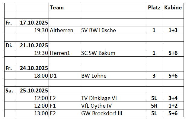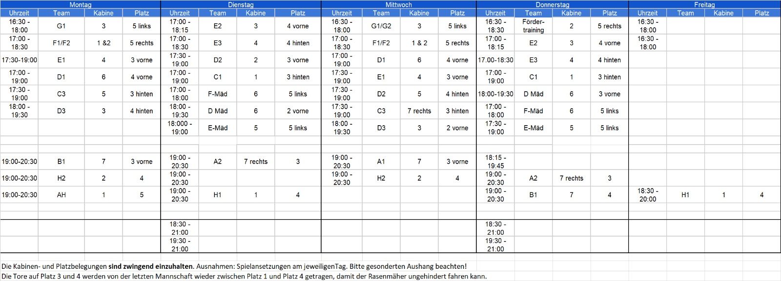 Platzbelegung Platzsperren Platz 1 (kein Training) Platz 2 Platz 3 Platz 4 Kleinfeld (bis E-Junioren) Legenden Frei Platzschonend trainieren gesperrt